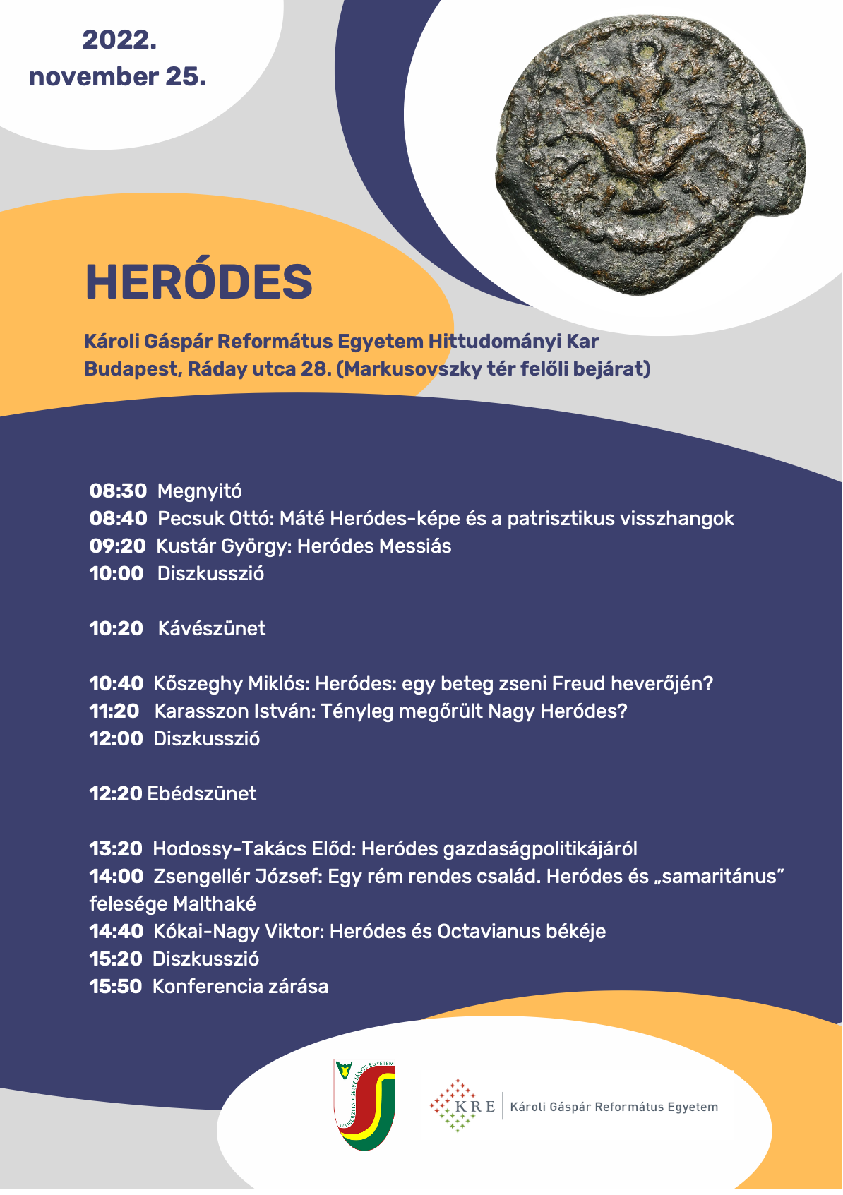 A Josephus Kutatóintézet megalapításakor eredendően az volt az ötletünk, hogy nem csupán Komáromban fogunk konferenciákat szervezni, hanem megpróbálunk eljutni minél több egyetemre és felsőoktatási intézménybe. Noha a Covid miatti szünet visszavetette a tervek megvalósulását, az eredeti elképzelést nem adtuk fel. Ahogyan azt az sem, hogy a kezdeti bizonytalan témameghatározások után, most már igyekezzünk tematikus konferenciákat rendezni. E két szál összefonódásából született a Heródes konferencia, aminek a Károli Gáspár Református Egyetem Hittudományi Kara adott otthont, Budapesten.